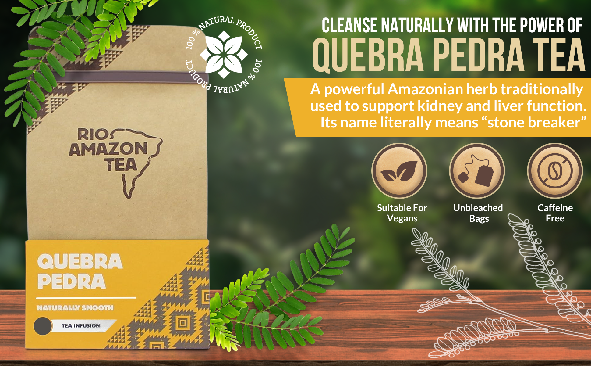 Quebra Pedra (Phyllanthus niruri) is a small annual plant found in the Amazon rainforest and other tropical areas including India and the Caribbean. This plant is used in many parts of the world including in Ayurvedic practice in India. Quebra Pedra is its Portuguese name, and translates to ‘Stone Breaker’. Rio Amazon Quebra Pedra tea bags make a tea having a naturally smooth, aromatic and pleasant taste.