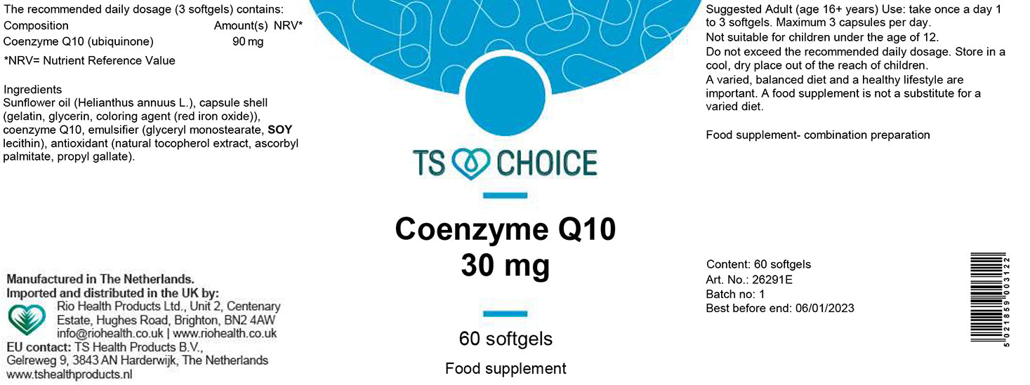Coenzyme Q10 is an enzyme component of cells, found mainly in the mitochondria. TS CoQ10 capsules comprise CoQ10 in the form of ubiquinone dissolved in soya bean.