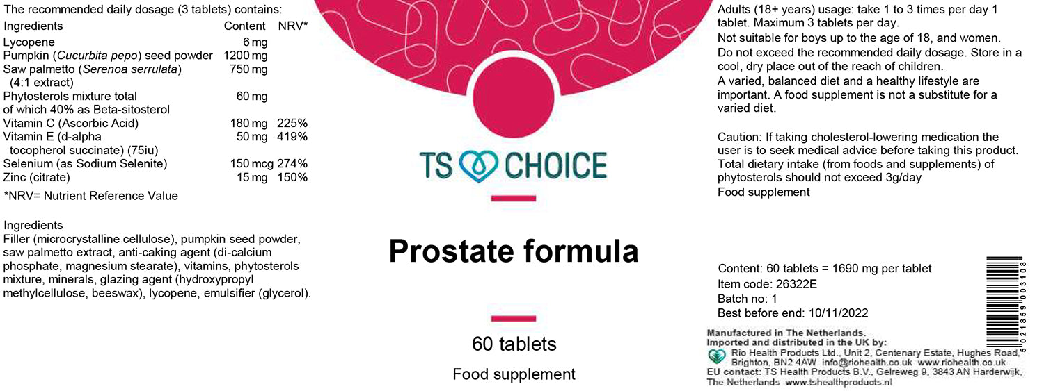 Filler (microcrystalline cellulose), pumpkin seed powder, saw palmetto extract, anti-caking agent (di-calcium phosphate, magnesium stearate), vitamins, phytosterols mixture, minerals, glazing agent (hydroxypropyl methylcellulose, beeswax), lycopene, emulsifier (glycerol).