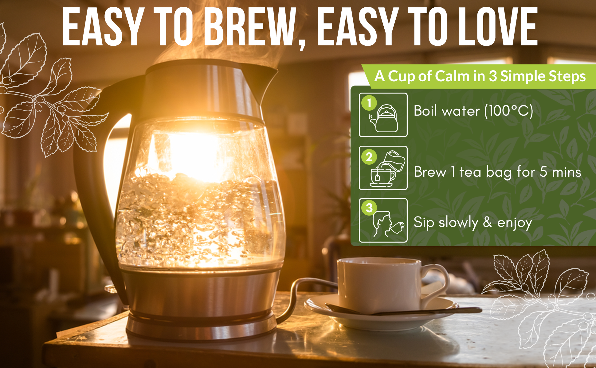 Infuse 1 teabag in hot water just off the boil (60-65 °C). Leave for a minimum of 5 minutes. Drink and enjoy.