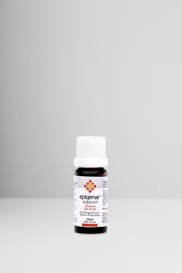 Vitamin D3 is naturally produced in humans by the skin when UVB light connects with the cells and converts cholesterol to pre-vitamin D, which is then converted to D3 (cholecalciferol) in the liver. It is estimated that 20 minutes of sun exposure in the summer months produces 20,000 IU of Vitamin D3. Vitamin D has a number of important roles to play in the body, including maintaining healthy bones and teeth, absorbing calcium and phosphorus, supporting normal cell division, helping to keep the immune system functioning normally and contributing to normal muscle function. Vitamin K2 is a fat soluble vitamin which may help to direct calcium to build strong bones. It also plays a role in blood-clotting. The Vitamin K in this formula is menaquinone (MK7) derived from Natto. One drop of Epigenar Vitamin D3 & K2 contains 1,000iu of Vitamin D3, and 12 mcg of Vitamin K2 in a base of sunflower oil. A 10ml bottle contains approximately 200 drops. A 25ml bottle contains approximately 500 drops.