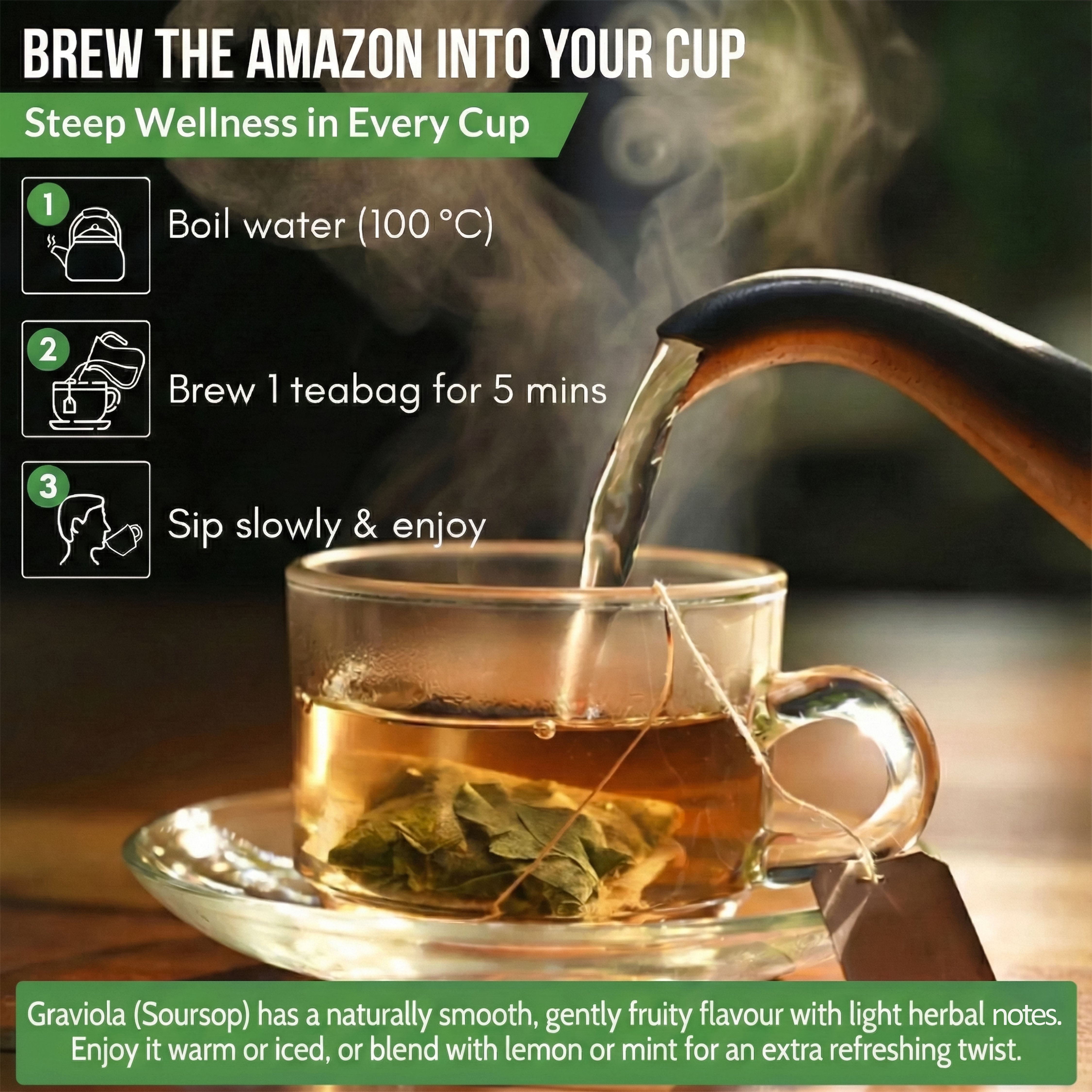 - Pure Graviola Leaves - Each unbleached teabag contains 1,800 mg of sustainably sourced Graviola leaf, carefully shredded for a full, authentic flavour.