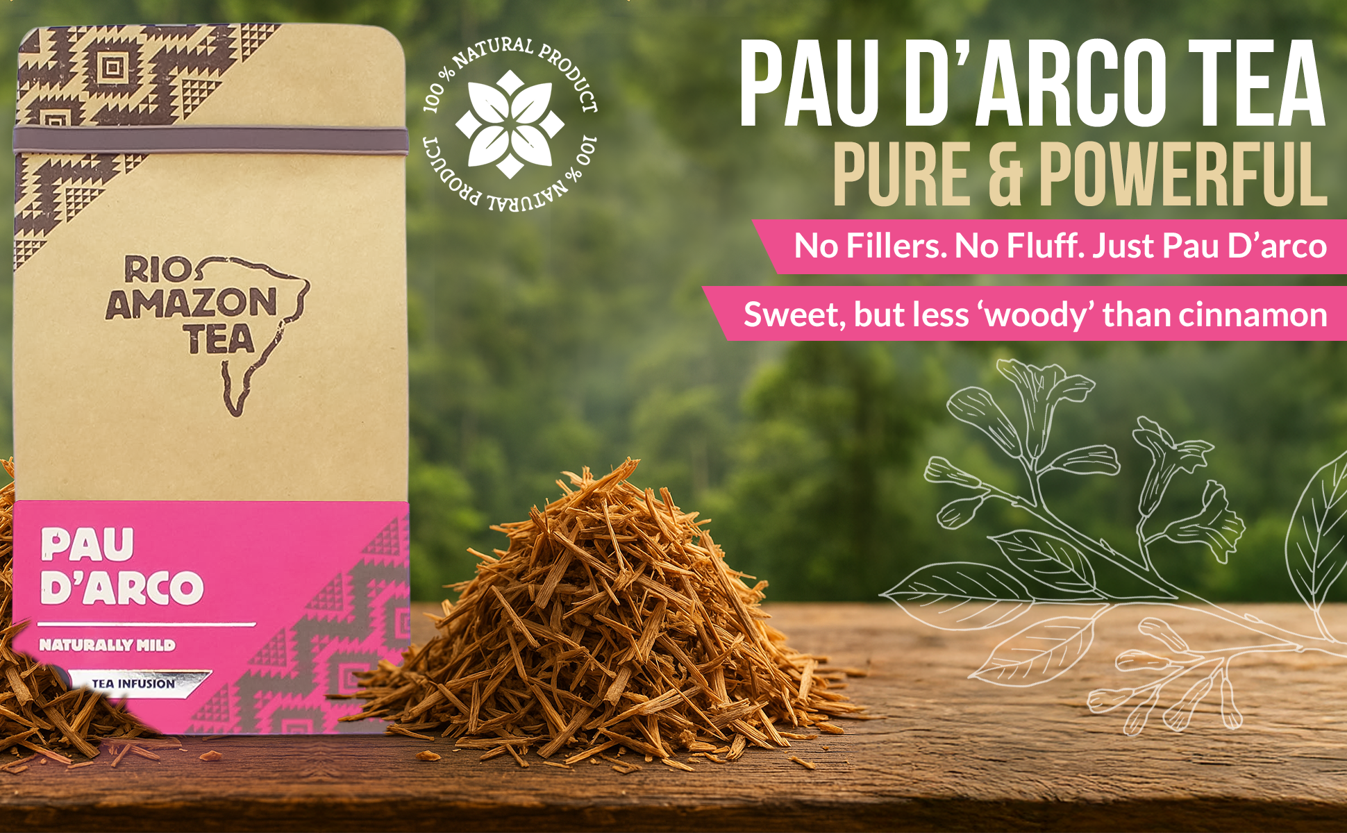 Made from 100% natural Lapacho bark, Rio Amazon Pau d’Arco Tea is a smooth, caffeine-free herbal infusion traditionally valued in the Amazon for its ability to support immunity, gentle detox, and daily vitality.