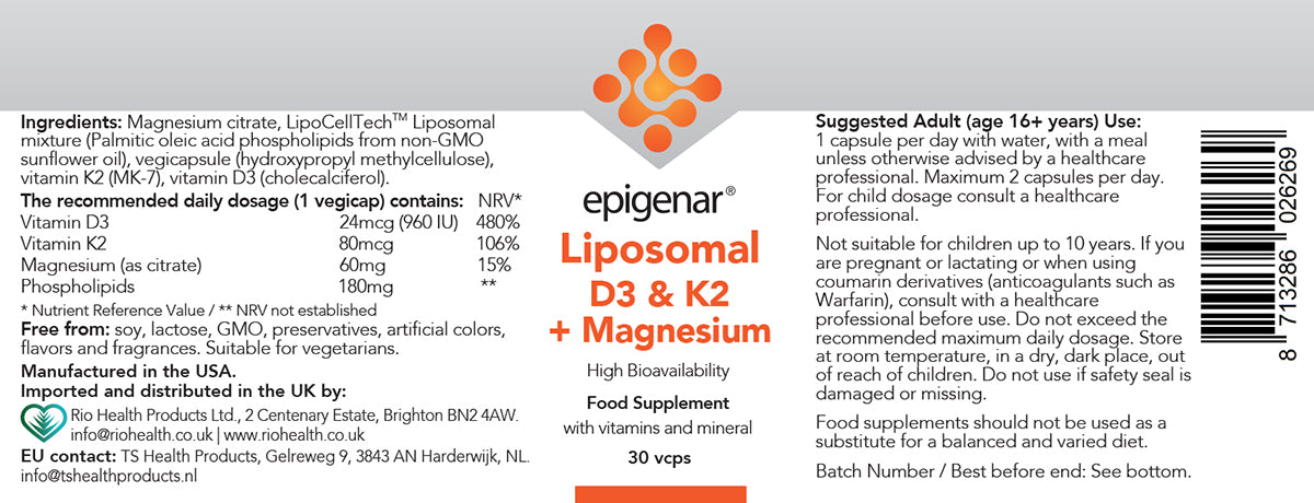 Liposomal D3 & K2 + Magnesium by epigenar is a dry liposomal nutrient product containing 960 IU of vitamin D3 alongside 80mcg of vitamin K2 (as MK-7) and 60mg of magnesium. Suitable for vegetarians. GMO-free.