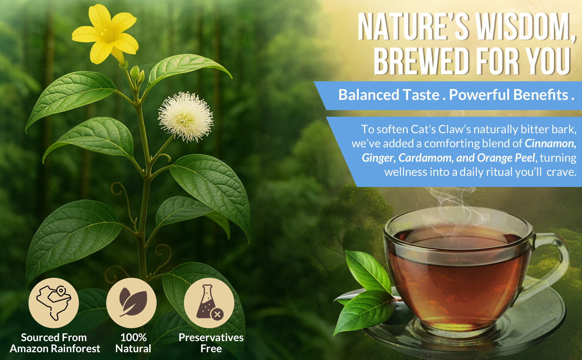 • Blend of Cat’s Claw (Uncaria tomentosa) with orange fruit, cinnamon, ginger and cardamom